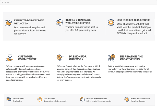 Translations added to Customizer => Conversion Boosters => Single Product Page Store Benefits (now you can translate estimated delivery date) WooCommerce 4.3.0 support addedVersion 1.0.9 - 03.07.2020