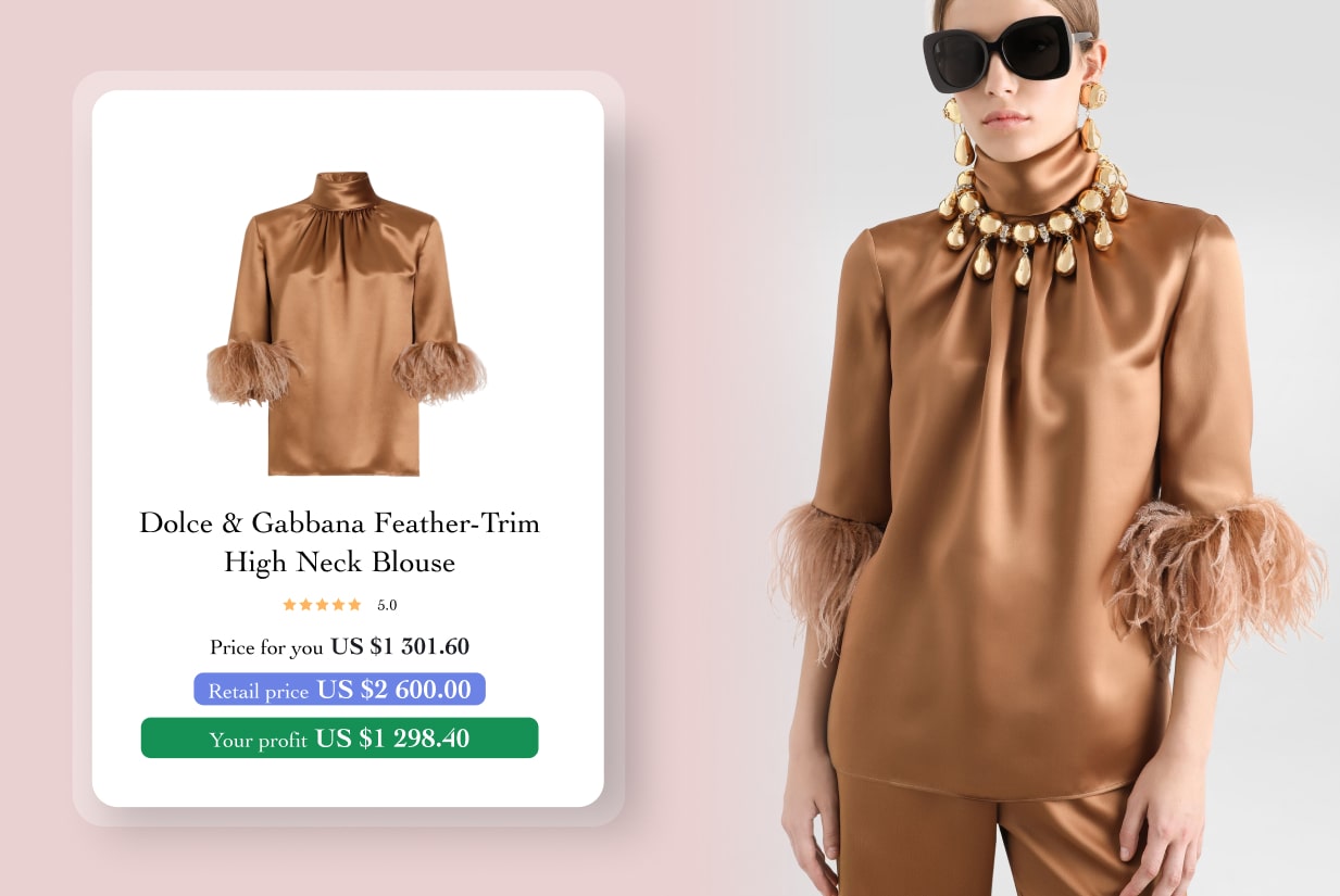 Increase order value by offering bundles with other upscale staples like satin skirts, heels, or clutch bags. Optimize your product listings with keywords such as “Dolce & Gabbana feather blouse,” “high neck designer top,” and “elegant formal blouse” to drive organic traffic. Position this showstopping blouse as an essential for women who want to exude confidence and elegance – one of the most stylish and desirable trending clothing products to sell in today’s luxury fashion market.