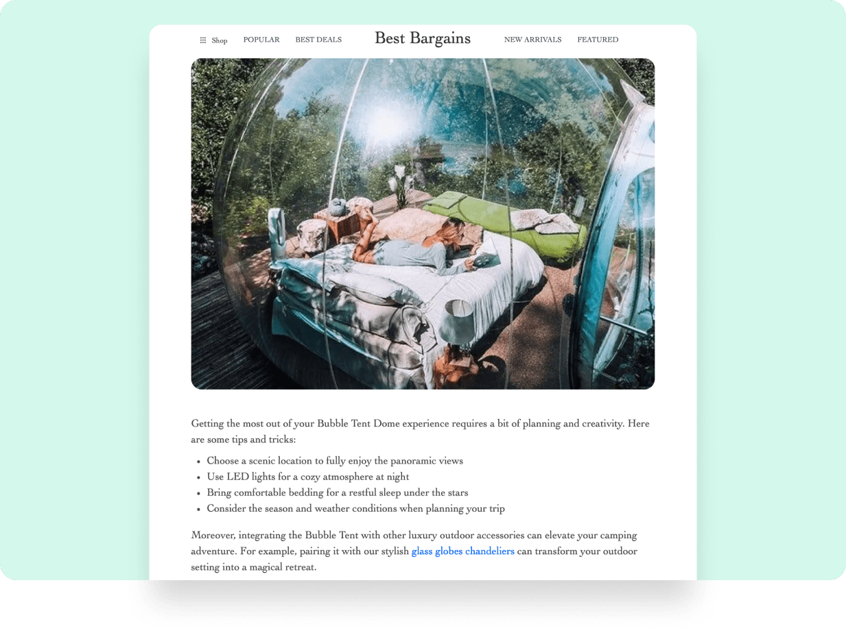 Example: if you’re selling camping gear, a blog post titled “Top 10 essential camping gear for beginners” not only helps your customers but also gives you a chance to rank for several relevant keywords like “best camping gear” or “camping essentials.”