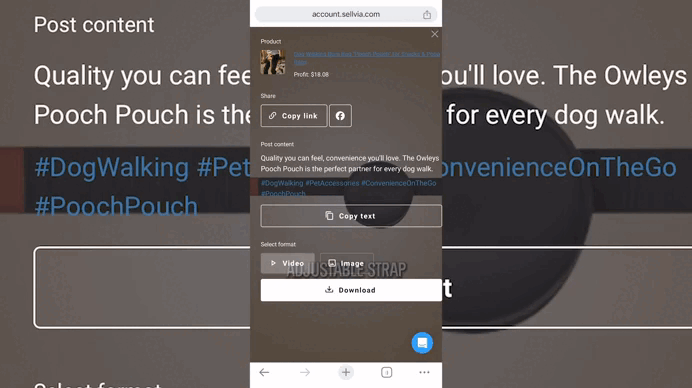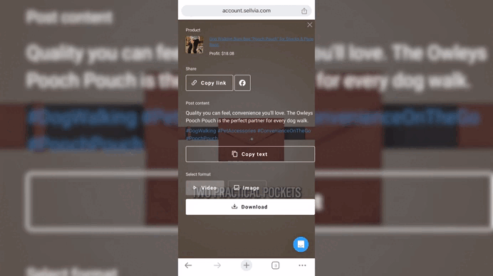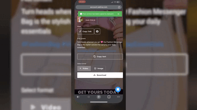 In your dashboard, select the product post you’d like to share, choose the format (image or video), and click the large white button to download it to your phone or other device: