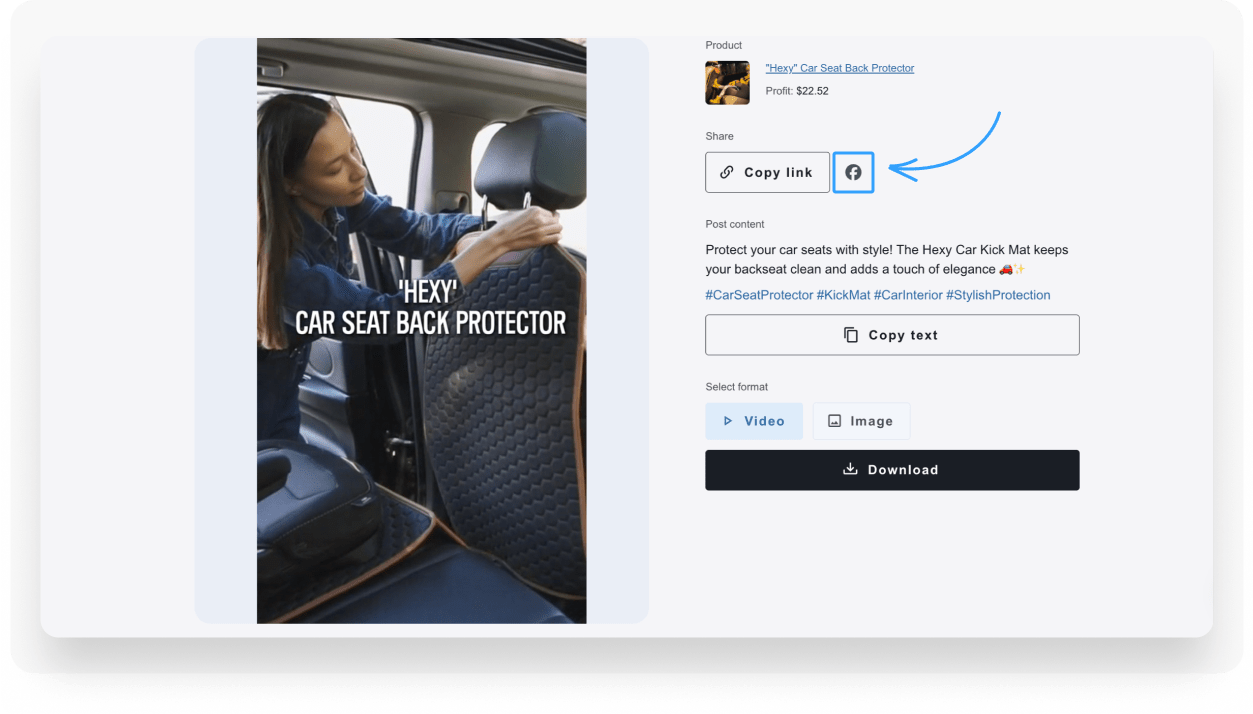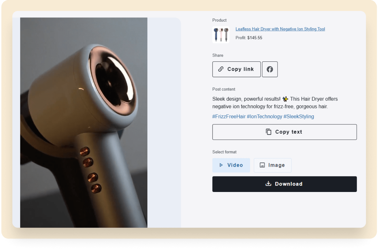 Step 7. You can also publish product posts without videos. Copy the text from the dashboard and click the Facebook icon. Paste the text into the post, hit Publish, and you’re done!