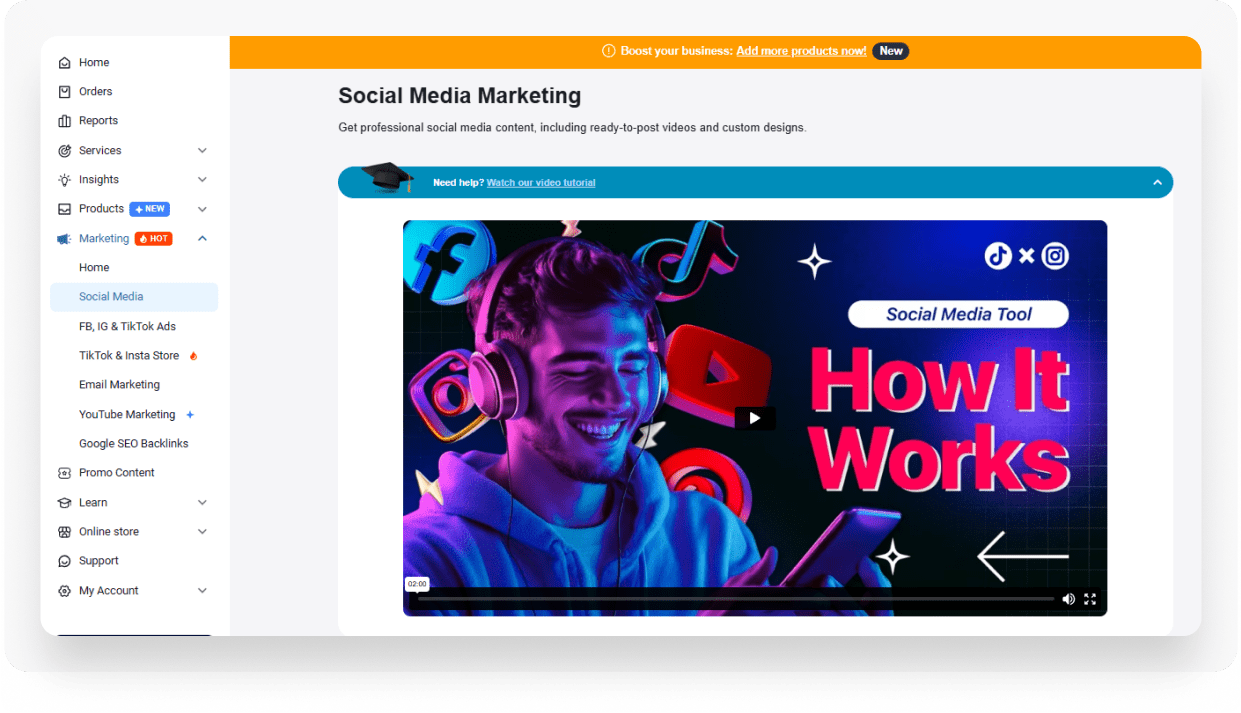 Step 2. Watch the brief introductory video – we highly recommend it. This video provides valuable insights on how to use Sellvia’s SMM tool effectively. It quickly covers why you need this tool and how it works, so even if you’re reading this review now, be sure to watch the video before getting started.