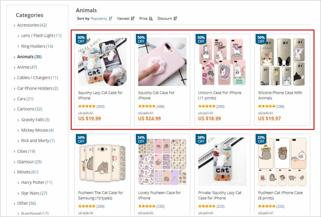 You make a search request “cat phone case” and choose “Newest” as a filter. Shown products in the list are not insanely popular and, in some cases, they were never yet bought… But the main point is a seller’s high rating.