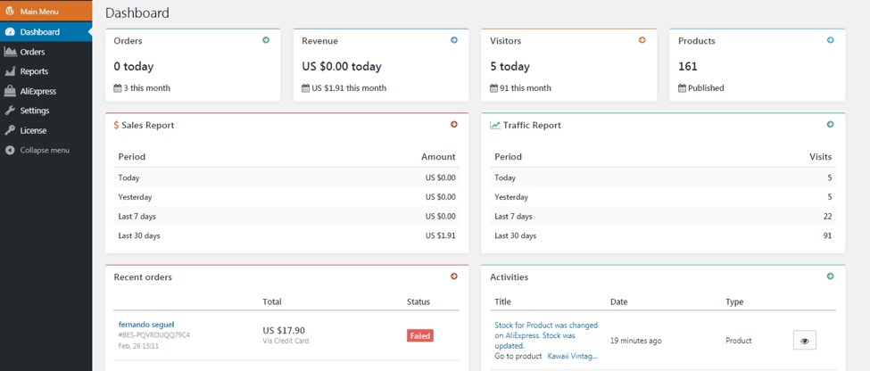 When you install the original AliDropship plugin and log in to view the admin panel, the first thing you see is a dashboard that shows the overview of your store stats (you can see the example below):
