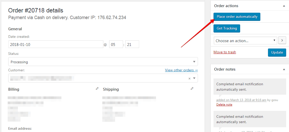 If you use the AliDropship Woo plugin, you need to go to the WooCommerce section, then choose the Orders tab, and click on the order you need to redirect. When the window with these order details opens, all you need to do is click on the ‘Place order automatically’ button.