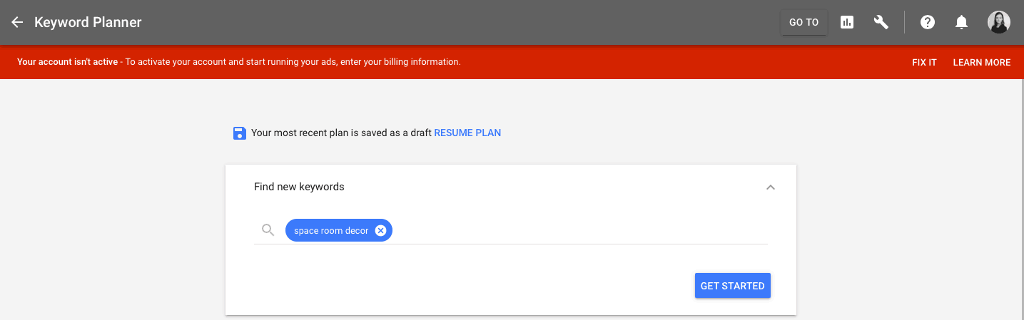 For a start, let’s try the following keyword: space room décor. To find out if it’s a good choice, we will use Google keyword planner.
