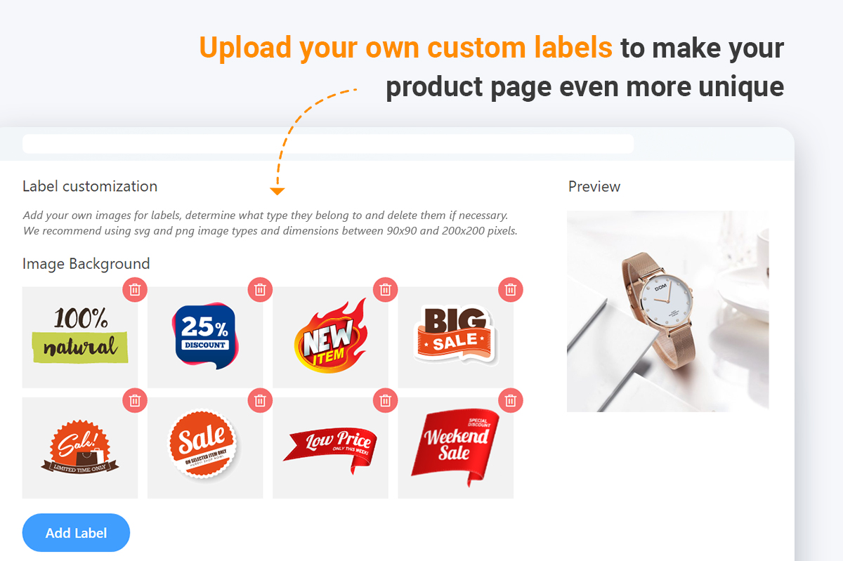 How can you highlight your store’s special offers? How to show off your best sellers? How to tell your potential customers about the new arrivals? There is one answer to all these questions: add labels to the product images! Attracting your store visitors at once, these small icons are highly likely to influence their buying decisions, so no one will go away without a purchase.