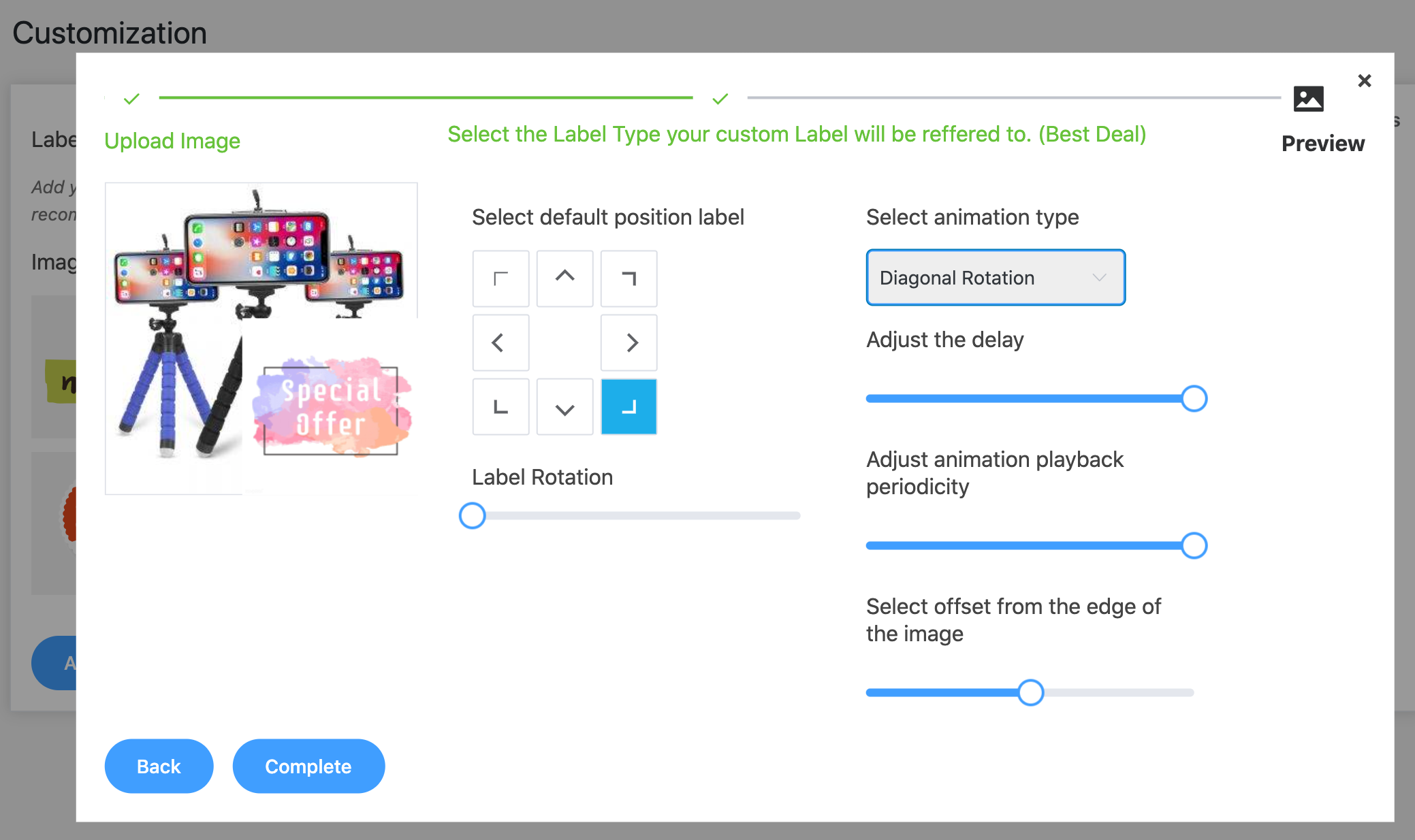 You are free to choose how your product labels will be shown on the product images! There are 8 placement options and 4 animation types available, so labels will work perfectly on any product page. You can define the settings for all the activated labels at once or set up each label type separately.