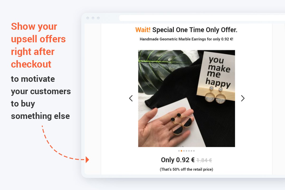 Purchase Upsell lets you entice customers with an attractive one-click pop-up that appears right after their successful payment. That means your offers won’t be distracting your store visitors during their on-site shopping journey.
