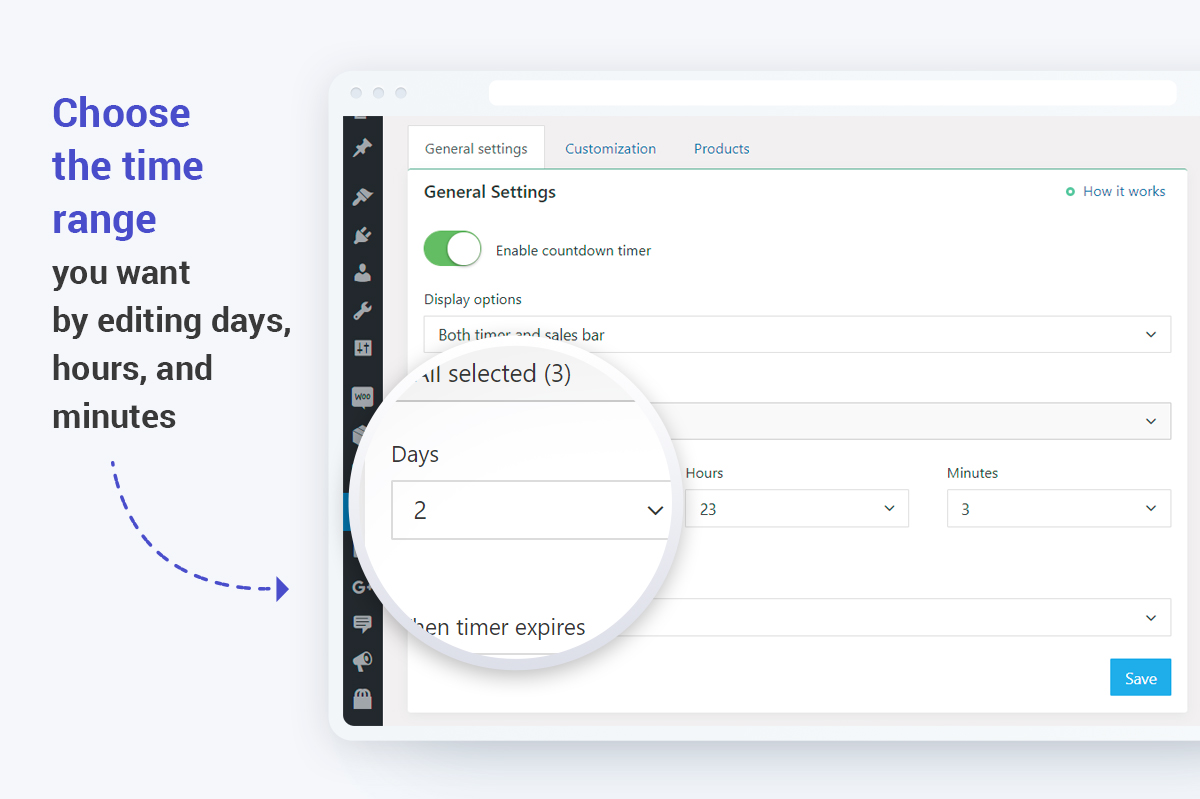 You need only five minutes to start increasing your profit and encouraging your clients to buy without hesitation. This time is enough to install, activate, and set up the Countdown Timer add-on, thanks to its clean and easy-to-use interface. Choose where to place your timer and how it will be displayed. Edit days, hours, and minutes to set up the time range. You can also select what will happen when the timer expires.