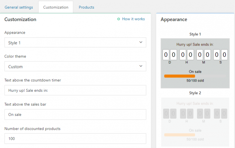 Thanks to easy customization, you can create a unique timer suitable to the look and feel of your online store. Choose from seven appearance options and six color themes, in addition to custom text options like font and color.