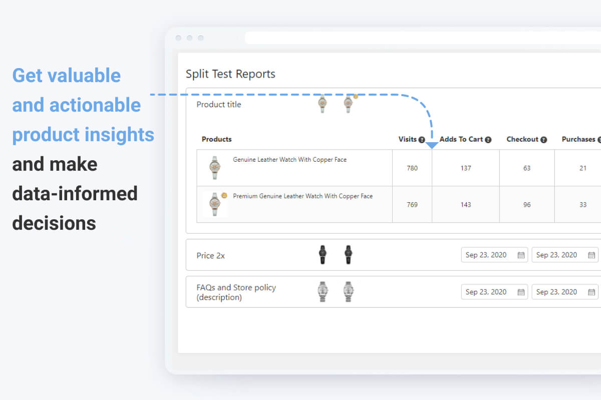 - Performance tracking. Take advantage of the detailed and accurate reporting feature that will show you which variant gets the most visitors, adds to cart, checkouts, purchases, and brings in more revenue.