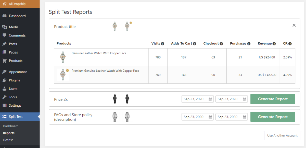 In the Reports tab, you’ll see detailed reports on how your products perform. No need to dig into heaps of information in your Google Analytics account. The Split Test add-on gathers the metrics that really matter to your business.