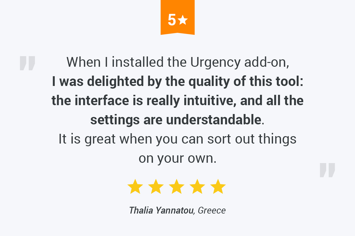 With Urgency, you can easily replicate the feeling of a popular shop where products are flying off the shelves. Benefit from the clients’ fear to miss out a good deal, create a sense of urgency and boost your revenue using this simple and convenient solution.